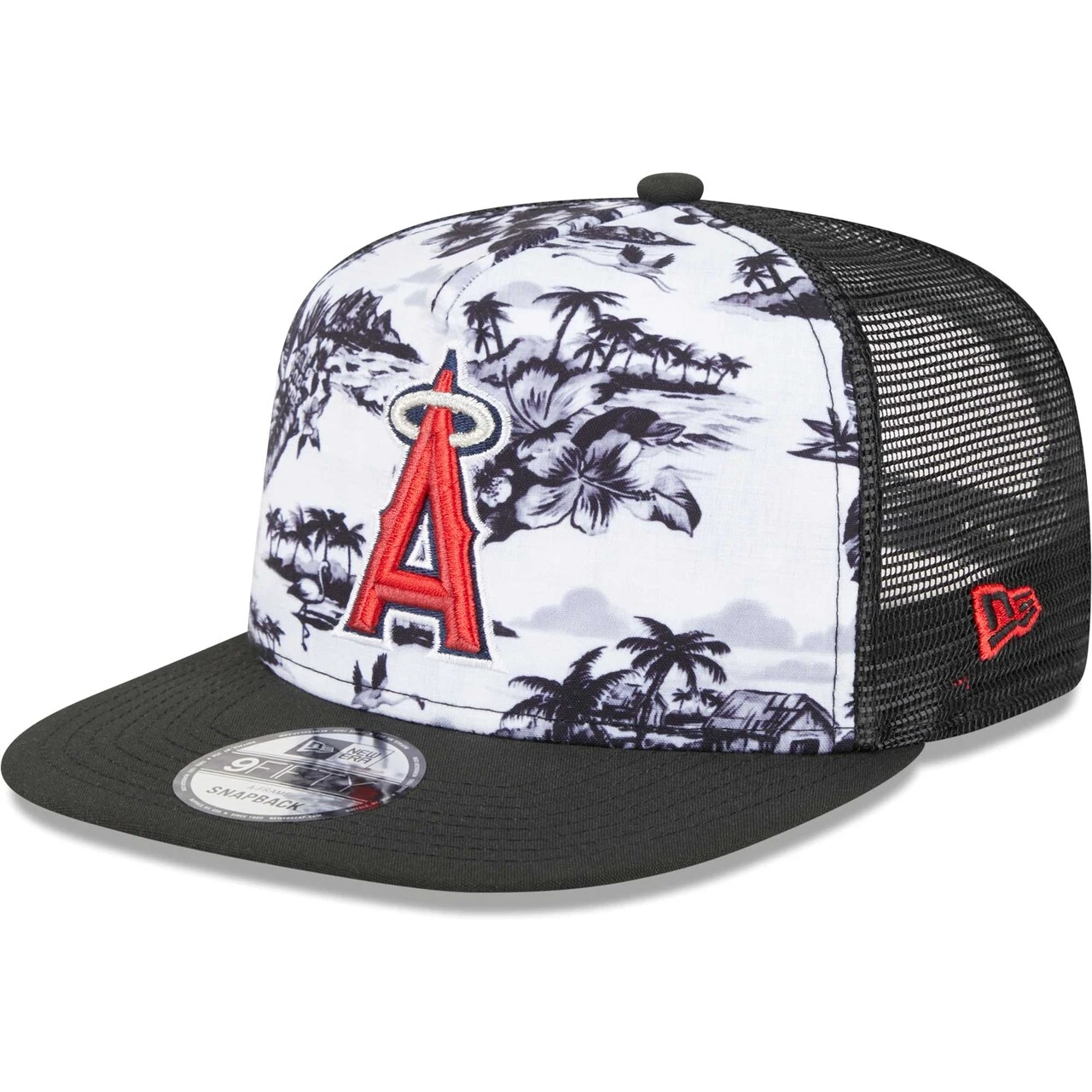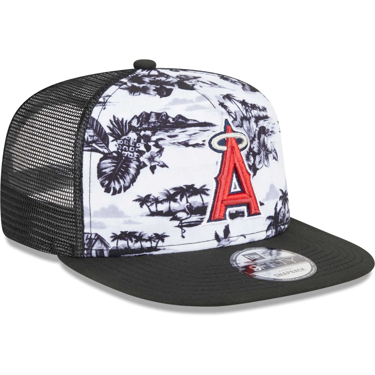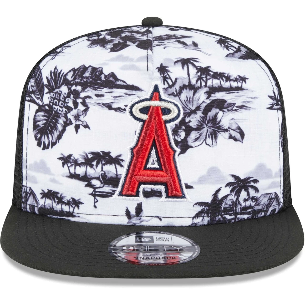 Kick back and relax in this Los Angeles Angels Vacay 2.0 A-Frame 9FIFTY cap from New Era. This trucker hat features a fun and calming pattern of palm trees, the beach and some flamingos with the Los Angeles Angels logo embroidered on top. The snapback construction will allow you to choose your comfort level and will help take your cares away.